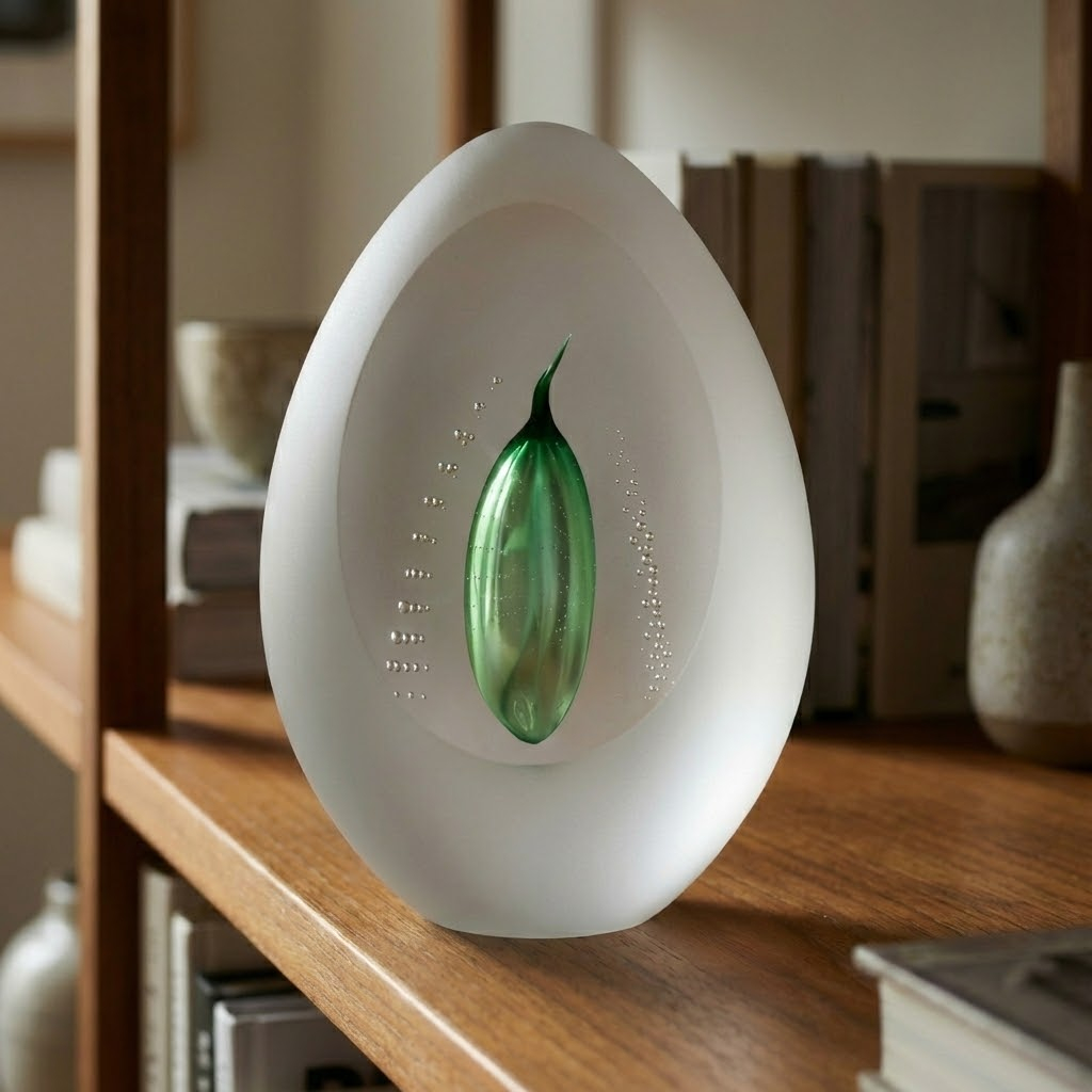 Ručně tvarované broušené těžítko s vnitřním dekorem ve tvaru vajíčka v různých barevných kombinacích. Povrch těžítek je matovaný. Vytvořená hladká plocha (jednoduše tomu říkáme "okno") vám dává prostor k jedinečnému pohledu do výrobku. Jedná se o originální skleněný výrobek vytvořený našimi skláři v České republice. Díky ruční práci je každý kus originál. To přináší malé rozdíly v síle, výšce, průměru nebo barevném tónu.
