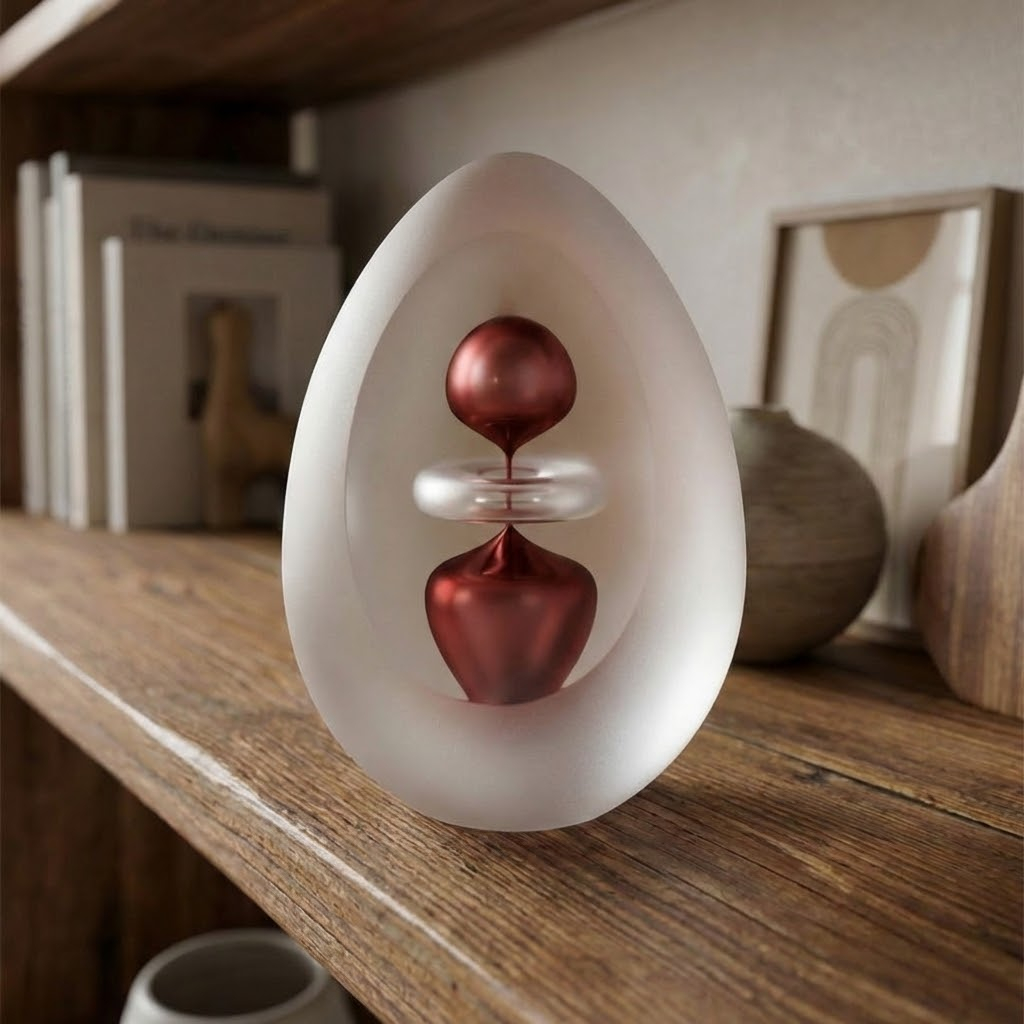Ručně tvarované broušené těžítko s vnitřním dekorem ve tvaru vajíčka v různých barevných kombinacích. Povrch těžítek je matovaný. Vytvořená hladká plocha (jednoduše tomu říkáme "okno") vám dává prostor k jedinečnému pohledu do výrobku. Jedná se o originální skleněný výrobek vytvořený našimi skláři v České republice. Díky ruční práci je každý kus originál. To přináší malé rozdíly v síle, výšce, průměru nebo barevném tónu.