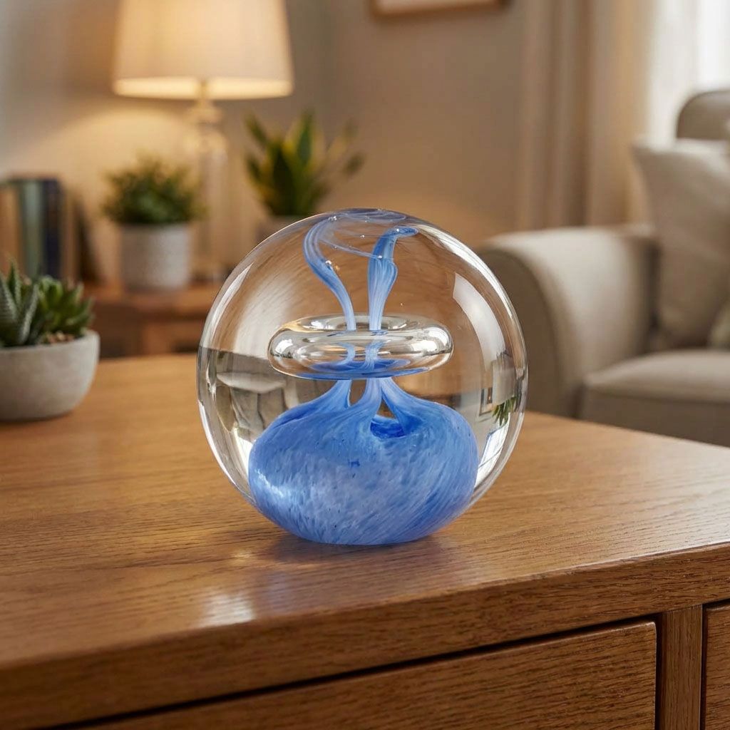 Ručně tvarované skleněné těžítko s vnitřním dekorem ve tvaru koule v různých barevných kombinacích. Jedná se o originální skleněný výrobek vytvořený našimi skláři v České republice. Díky ruční práci je každý kus originál. To přináší malé rozdíly v síle, výšce, průměru nebo barevném tónu.
