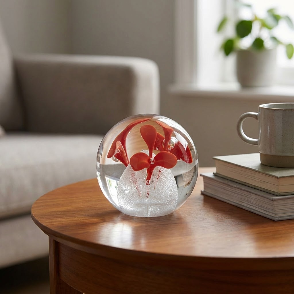 Ručně tvarované skleněné těžítko s vnitřním dekorem ve tvaru koule v různých barevných kombinacích. Jedná se o originální skleněný výrobek vytvořený našimi skláři v České republice. Díky ruční práci je každý kus originál. To přináší malé rozdíly v síle, výšce, průměru nebo barevném tónu.