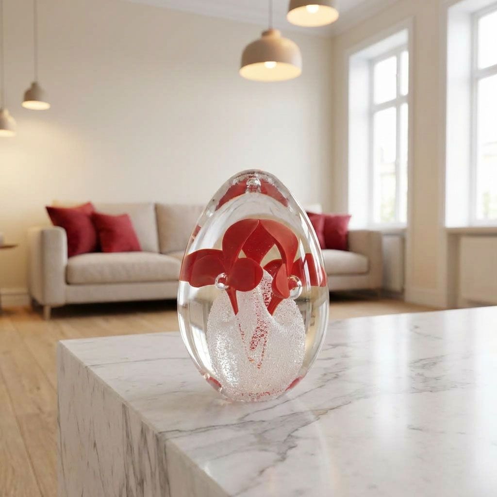 Ručně tvarované skleněné těžítko s vnitřním dekorem ve tvaru vajíčka v různých barevných kombinacích. Jedná se o originální skleněný výrobek vytvořený našimi skláři v České republice. Díky ruční práci je každý kus originál. To přináší malé rozdíly v síle, výšce, průměru nebo barevném tónu.
