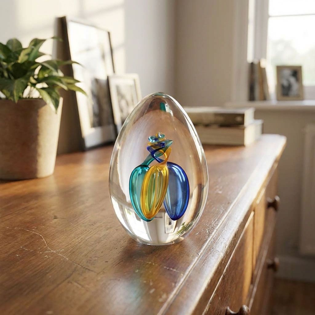 Ručně tvarované skleněné těžítko s vnitřním dekorem ve tvaru vajíčka v různých barevných kombinacích. Jedná se o originální skleněný výrobek vytvořený našimi skláři v České republice. Díky ruční práci je každý kus originál. To přináší malé rozdíly v síle, výšce, průměru nebo barevném tónu.